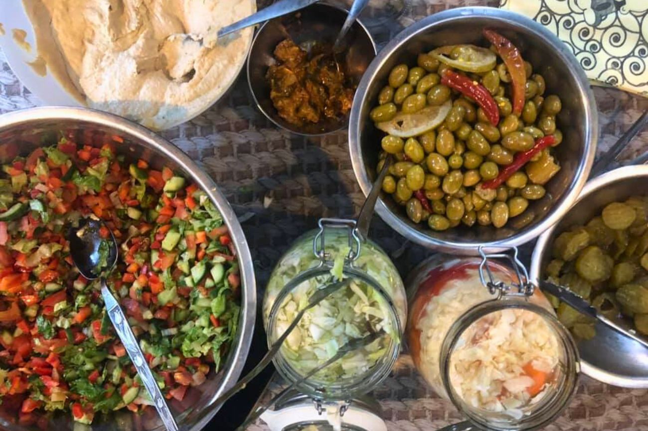 מעדני הבית כוללים לבנה וחומוס מתוצרת עצמית, וגם ריבות מפירות העונה כמו תאנים, פטל ונקטרינות.