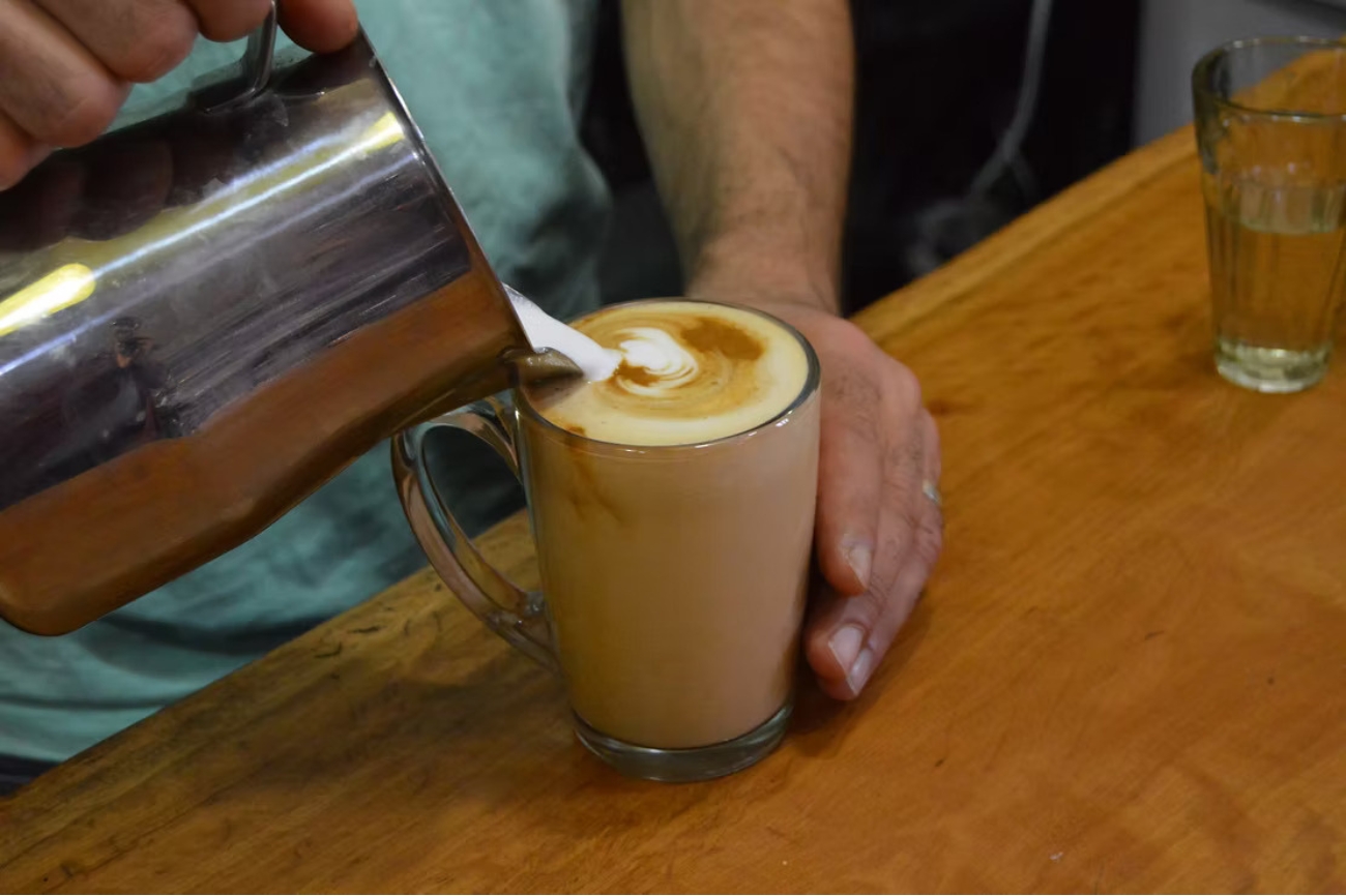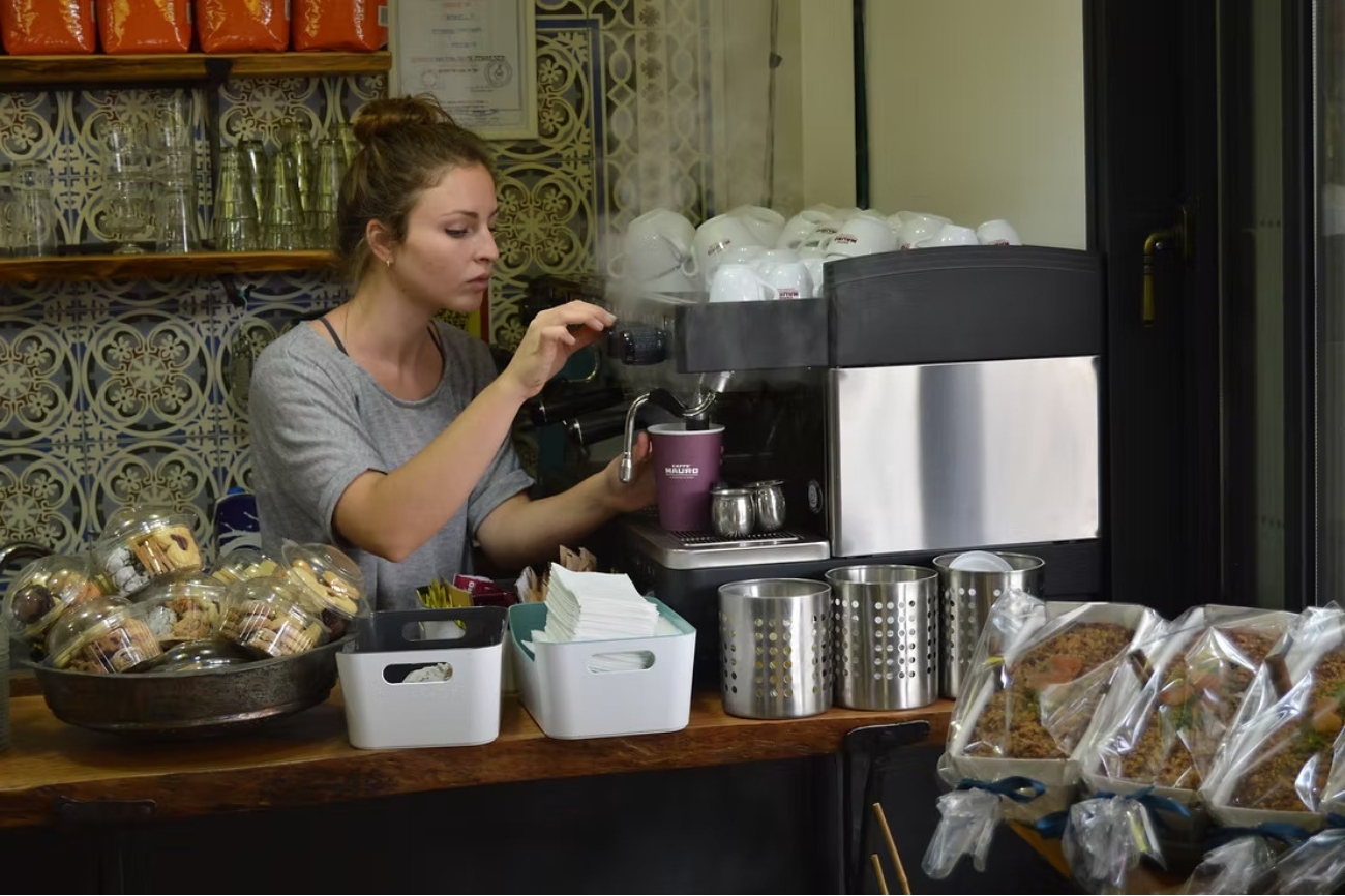 בית הקפה נמצא על דק עץ במרפסת מקורה, והישיבה היא על כסאות בר ושולחנות גבוהים. גם בקונדיטוריה ניתן לשבת על בר קטן שמשקיף אל בית הקפה.